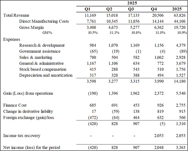 This press release contains forward-looking statements, including statements that relate to, among other things, revenue, purchase orders, revenue guidance of more than 30% revenue growth (exceeding $83 million) over FY 2025 in FY 2026, order growth and customer demand in FY 2026, mass production schedules, , the Company's ability to start production of cells at the Jamestown, New York facility by end of CY 2026, future business opportunities, use of proceeds, ability to deliver to customer requirements and revenue growth forecasts for the fiscal year ending September 30, 2026. Forward-looking statements can generally, but not always, be identified by the use of words such as "may", "will", "could", "should", "would", "likely", "possible", "expect", "intend", "estimate", "anticipate", "believe", "plan", "objective" and "continue" (or the negative thereof) and words and expressions of similar import. Although the Company believes that the expectations reflected in such forward-looking statements are reasonable, assumptions and analyses made by the Company in light of the experience and perception of historical trends, current conditions and expected future developments and other factors it believes are appropriate are necessarily applied in making forward looking statements and such statements are subject to risks and uncertainties, therefore actual results may differ materially from those expressed or implied in such statements and undue reliance should not be placed on such statements. Material assumptions made in disclosing the forward-looking statements included in the news release include, but are not limited to assumptions that the Company's customers will deploy its products in accordance with communicated timing and volumes, that the Company's customers will complete new distribution centers in accordance with communicated expectations, intentions and plans, the sum of anticipated new orders in FY 2026 based on customers' historical patterns and additional demand communicated to the Company and its partners but not yet provided as a purchase order with the Company's current firm purchase order backlog totaling approximately $100-125 million, a discount of approximately 25% used in the revenue modeling applied to the overall expected order pipeline to account for potential delays in customer orders, expected decreases in input and material costs combined with stable selling prices in FY 2026, and a stable political climate with respect to exports from Canada to the United States, the start up time for manufacturing in Jamestown NY is estimated towards the end of FY 2026 or first quarter of FY 2027, the ability to leverage IRA45X credits, the ability to receive incentives from the state of New York, the ability to improve margins from domestic manufacturing, and the ability to attract additional customers through domestic manufacturing. Factors that could cause actual results to differ materially from expectations include but are not limited to customers not placing orders roughly in accordance with historical ordering patterns and communicated intentions resulting in annual revenue growth in FY 2026 of more than 30% over FY 2025 (exceeding $83 million), the predictability of sales and success of the Company's products in verticals other than material handling, the imposition of a tariff regime on Canadian exports by the United States, macroeconomic effects on the Company and its business and on the lithium battery industry generally, the Company's liquidity and cash availability in excess of its operational requirements, and the ability to generate and sustain sales orders. Additional information about material factors that could cause actual results to differ materially from expectations and about material factors or assumptions applied in making forward-looking statements may be found in the Company's Annual Information Form for the year ended September 30, 2025 under "Risk Factors", in the Company's base shelf prospectus dated September 17, 2024, and in the Company's most recent annual and interim Management's Discussion and Analysis under "Qualitative And Quantitative Disclosures about Risk and Uncertainties" as well as in other public disclosure documents filed with Canadian securities regulatory authorities. The Company does not undertake any obligation to update publicly or to revise any of the forward-looking statements contained in this document, whether as a result of new information, future events or otherwise, except as required by law.