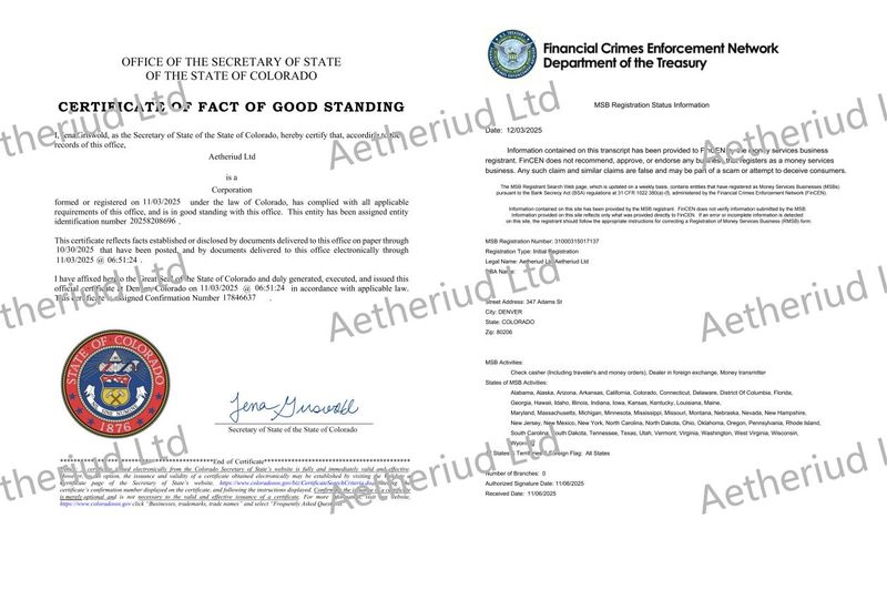 Aetheriud is among the very few digital asset trading platforms operating under U.S.regulatory standards,having completed FinCEN MSB registration,IRS EIN certification,and Colorado Good Standing compliance.