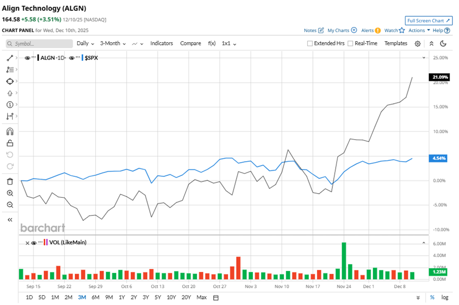 Despite its notable strength, ALGN slipped 33.1% from its 52-week high of $246.19, achieved on Dec. 11, 2024. Over the past three months, ALGN stock gained 23.8%, outperforming the S&P 500 Index’s ($SPX) 5.4% gains during the same time frame.