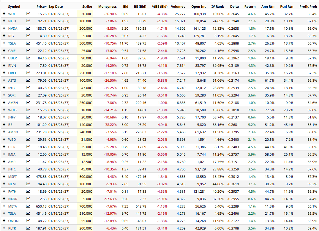 This first example shows the results of the screener with the default parameters selected and sorted by option volume.