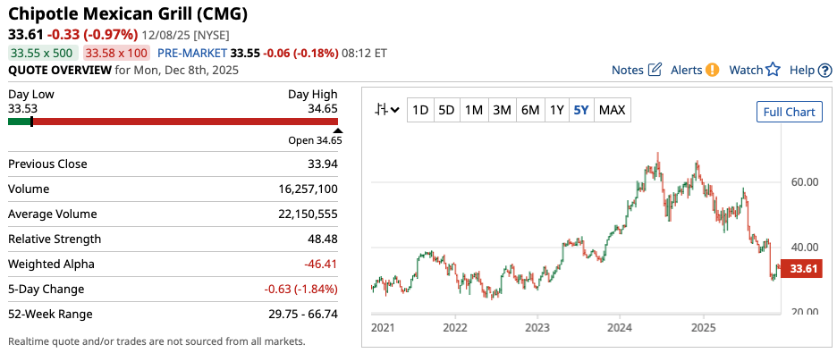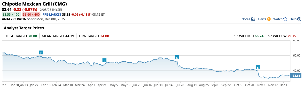 There are currently 33 Wall Street analysts covering Chipotle who give CMG stock a consensus “Moderate Buy” rating. With a mean price target of $44.39 for CMG, and given where this stock is trading at current levels, there's some rather juicy potential upside of around 31% from here.