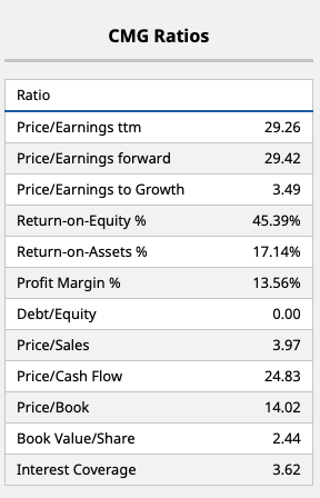 With a gross margin of around 13.6% and solid return-on-equity and return-on-asset numbers, these numbers don't look that bad at first glance. That said, Chipotle's forward price-to-earnings multiple has come down considerably (now trading below 30 times) and, despite this drop, some investors still view the company as relatively overvalued if it can't return to its previous growth rates moving forward. Indeed, a PEG ratio of around 3.5 indicates such a view is likely valid.