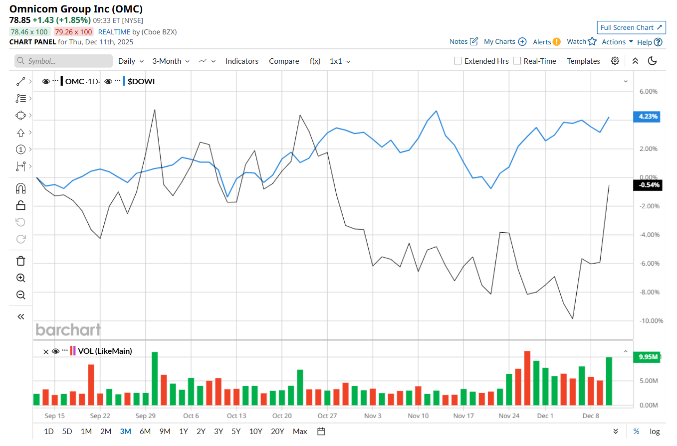 This advertising company has slipped 17.1% below its 52-week high of $93.42, reached on Dec. 11, 2024. Shares of OMC have gained 1.9% over the past three months, underperforming the Dow Jones Industrial Average’s ($DOWI) 5.6% rise during the same time frame.