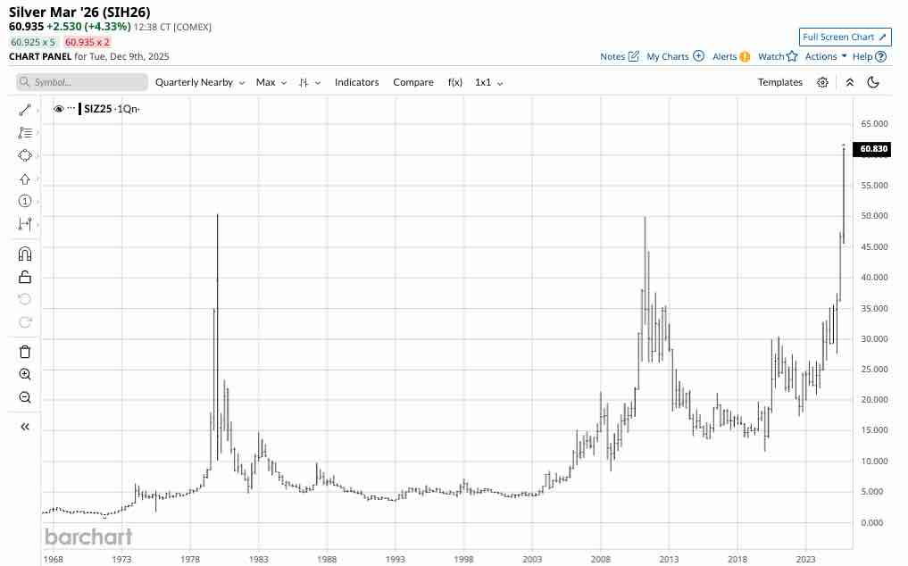 I asked if silver prices had reached a peak in a November 20, 2025, Barchart article, where I concluded with the following: