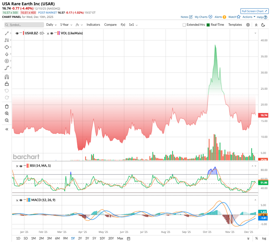 But beneath that slide lies a stunning rebound story. From its March lows of $5.56, USAR has roared back almost 190%, proving that investor confidence in America’s rare-earth reboot has not evaporated.