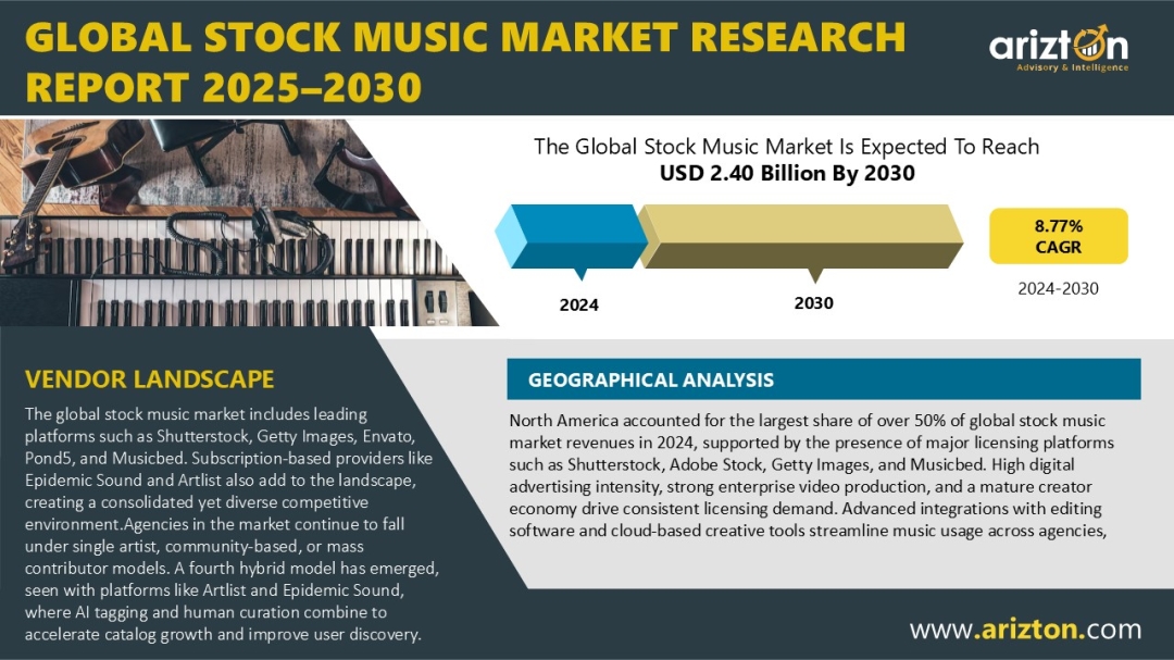The global stock music market, valued at USD 1.45 billion in 2024, is set to expand to USD 2.40 billion by 2030, growing at a CAGR of 8.77%, according to Arizton research. As digital content and video campaigns dominate every industry, stock music has become a must-have creative tool, corporate communications and online tutorials to YouTube videos, social media, and podcasts. Fueled by vast, searchable catalogs and clear commercial-use licensing, the market empowers creators and businesses alike to produce professional, engaging content at speed, unlocking new revenue streams and creative possibilities.