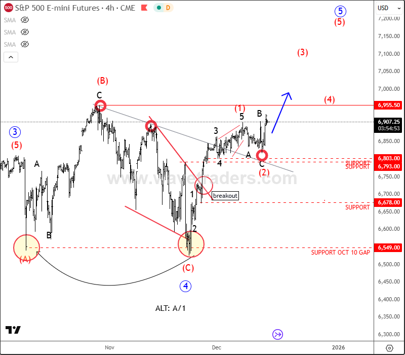 After the recent projected ABC irregular flat correction in wave (2), we can now see it in a bullish resumption within wave (3), so watch out for a break into all-time highs and 7k area soon.