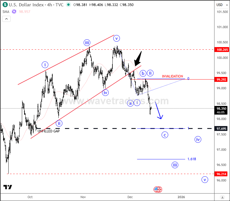 The reason why stocks can stay in the bullish trend is bearish USDollar Index – DXY. DXY made higher highs and higher swing lows from September when the Fed cut rates, with stock markets beeing under pressure since expectations for further cuts have decreased. But this has changed recently, and what’s really important now is that despite this recovery from September lows, we still see an overlapping wave structure, so it can easily be a five-wave movement that can even represent a diagonal in wave C, meaning a reversal pattern that could send prices lower now, after completion of the higher-degree wave four.