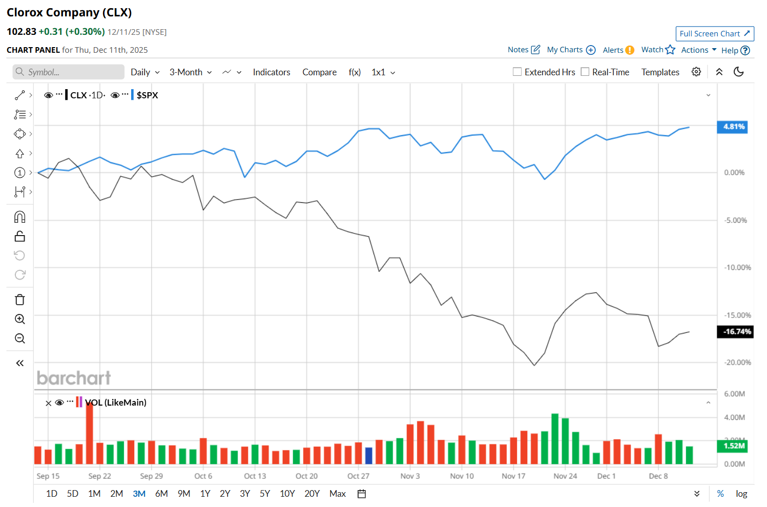 This consumer goods manufacturer has slipped 38.2% below its 52-week high of $166.35, reached on Dec. 16, 2024. Shares of CLX have declined 17.4% over the past three months, considerably underperforming the S&P 500 Index’s ($SPX) 4.8% rise during the same time frame.