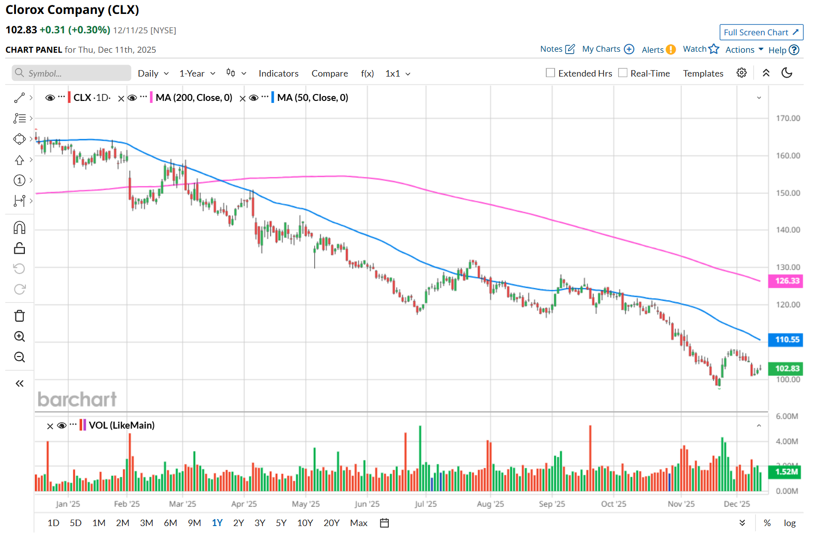To confirm its bearish trend, CLX has been trading below its 200-day moving average since early March, and has remained below its 50-day moving average over the past year, with slight fluctuations.