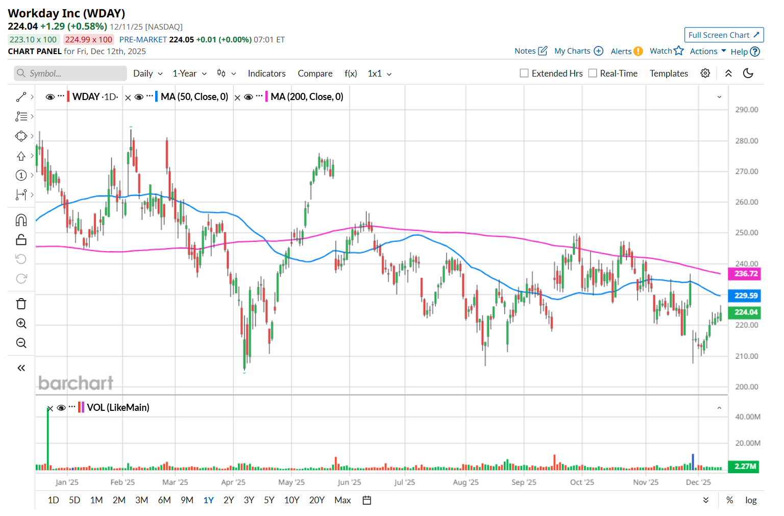 To confirm its bearish trend, WDAY has been trading below its 200-day moving average since late May, with minor fluctuations, and has remained below its 50-day moving average since early November.