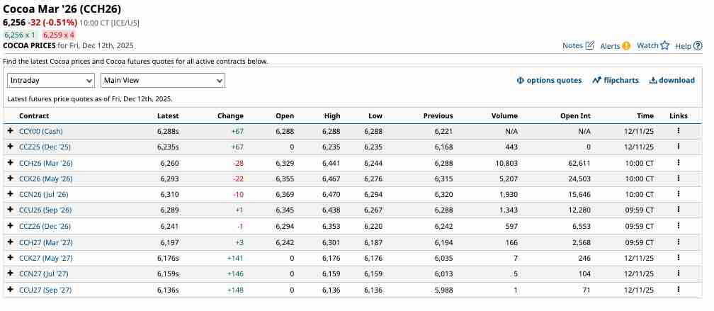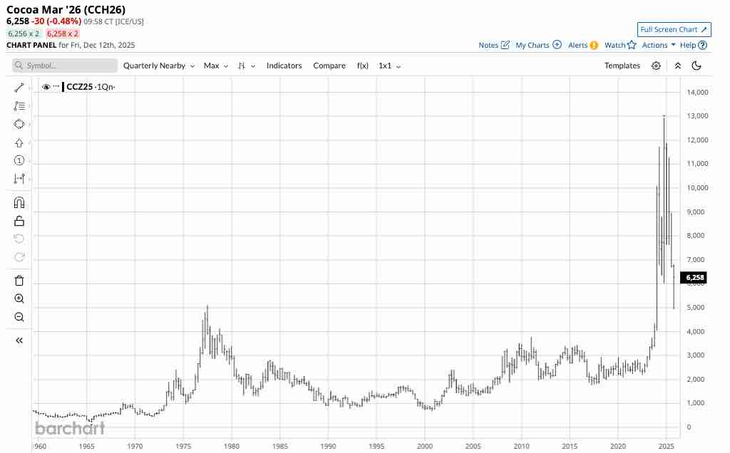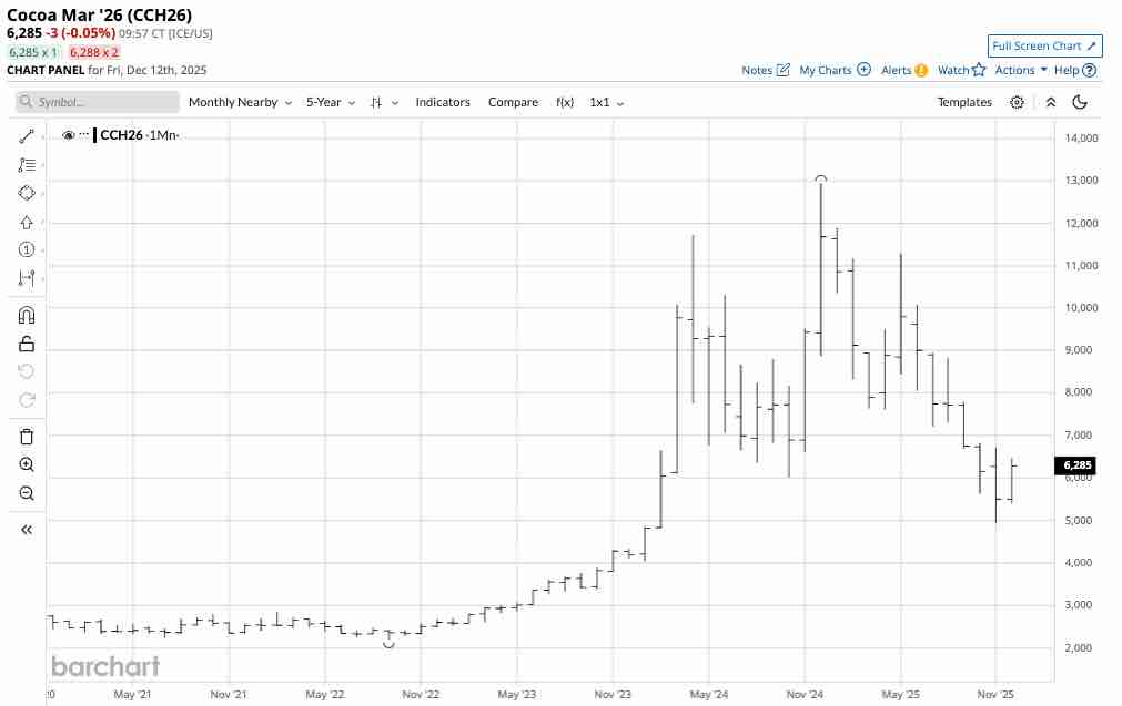 The monthly continuous contract chart shows the price plunge and steady decline that took cocoa futures to the most recent November 2025 low of $4,924 per ton, a 61.9% drop. At nearly $6,300 in December 2025, cocoa futures remain in a bearish trend despite the price recovery.Â