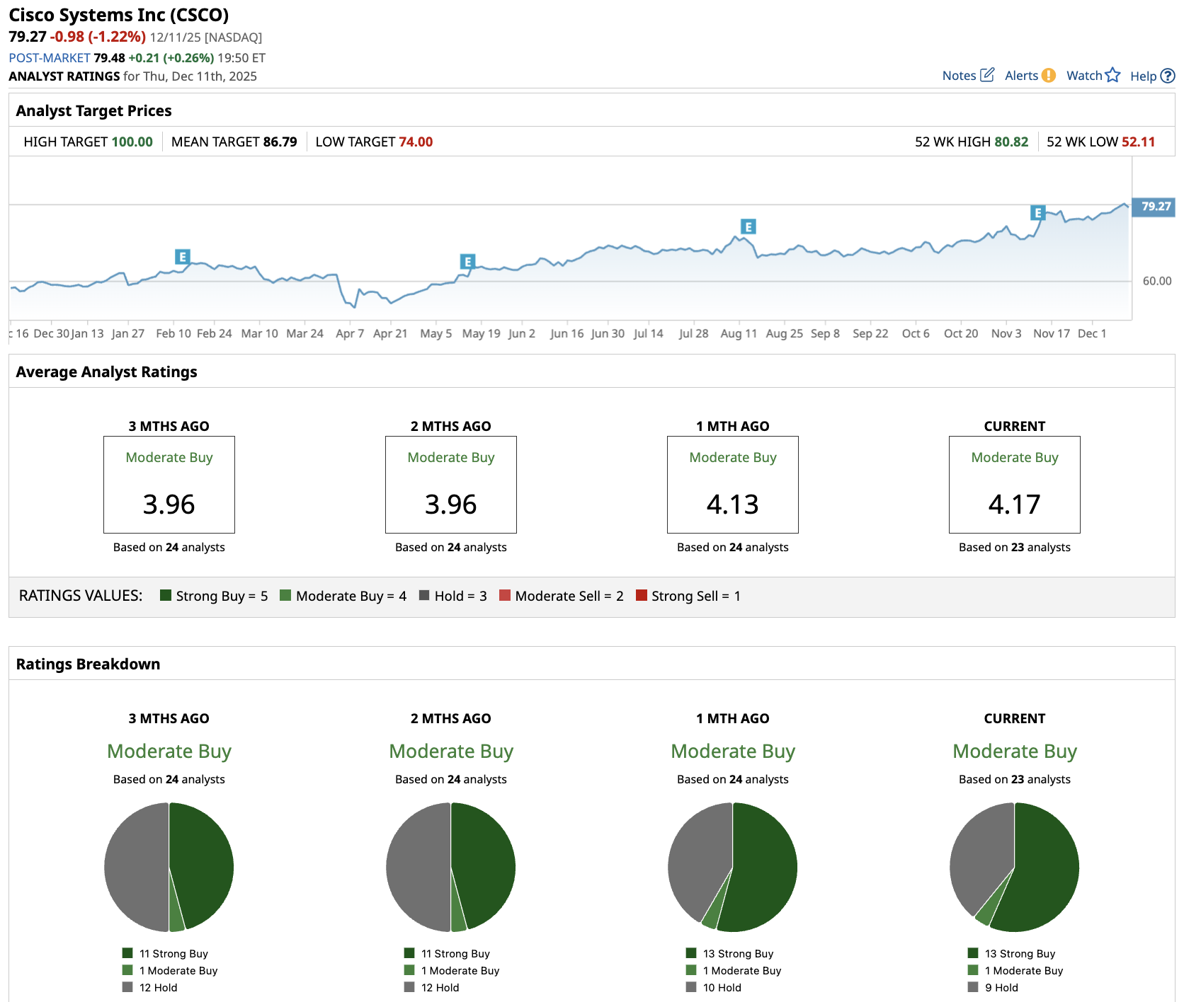 Out of the 23 analysts covering CSCO stock, 13 recommend “Strong Buy,” one recommends “Moderate Buy,” and nine recommend “Hold.” The average Cisco stock price target is $86.79, above the current price of about $79.