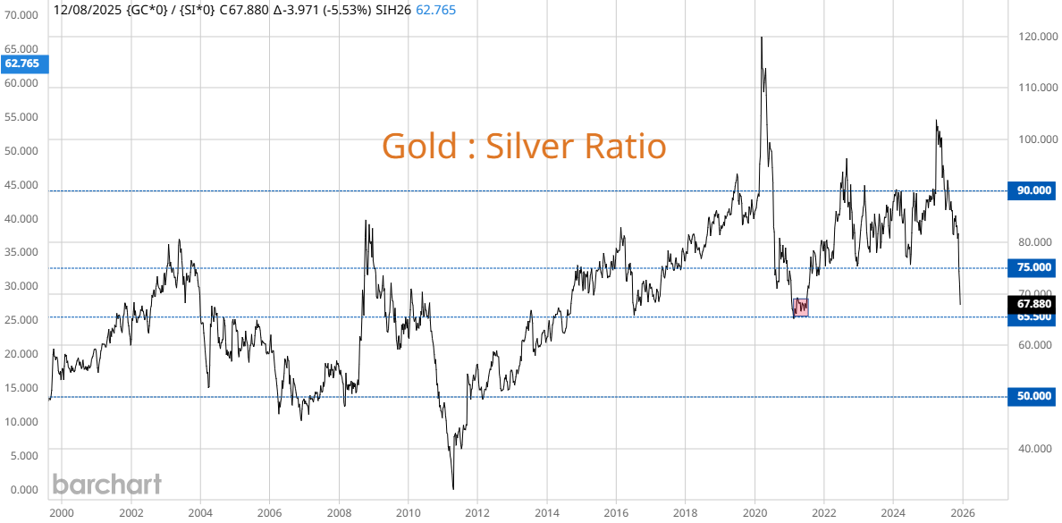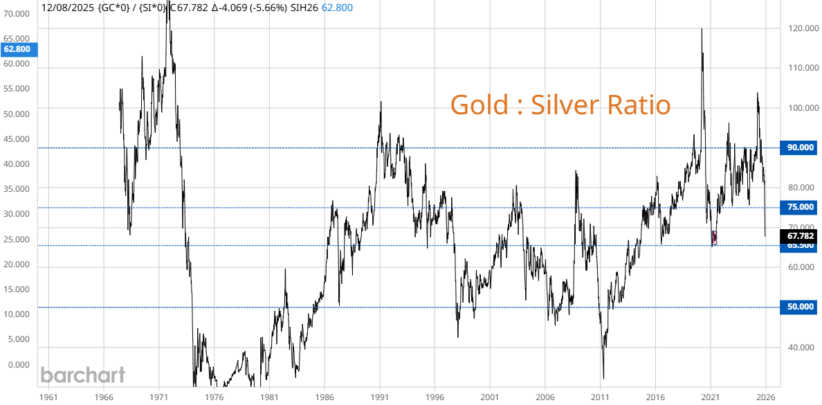 But it does look like we are reaching a level in the ratio – 65.5% – where gold might become more attractive, and silver may have reached a price peak. The 65.5 point of comparison represents a level of support to the price of gold not seen since COVID, when all metals started to rally.