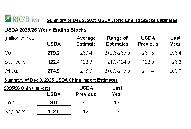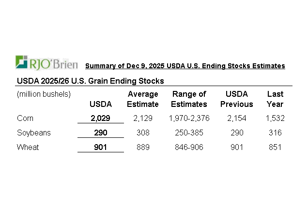 The USDA released its monthly WASDE and Crop Production reports on Tuesday this week. US corn ending stocks for 2025/26 came in at 2.029 billion bushels, lower than the average trade guesses at 2.129 billion bushels, which was already a cut from last month’s 2.154 billion bushels. For US soybean ending stocks, the USDA pegged the figures at 290 million bushels, lower than the average trade expectations at 308 million bushels, but equal to prior figures. US wheat ending stocks came in above average trade guesses at 901 million bushels versus 889 million bushels expected, but equal to USDA’s prior numbers.Â