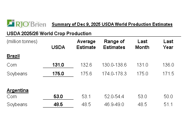 For the South American row crops, the USDA kept Brazil’s corn and soybean production unchanged while trade expectations were for a slight increase. Argentine production of corn and soybeans were also left unchanged from last month while slight increases were expected for corn.  So far, South American weather remains favorable and is adding downward pressure to soybean futures, in particular.Â