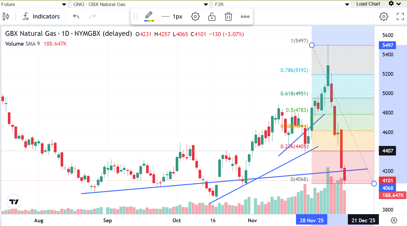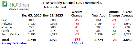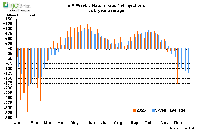 After this cold spell, there is a dramatic shift back to warmer temperatures that look to last through Christmas. Perhaps that is the explanation behind the apocalyptic plunge in natural gas futures that from last Friday’s high at $5.496 on January futures to this Friday’s low at $4.065, has lost an incredible $1.431 in one week! They don’t call this contract the ‘widow-maker’ for nothing and this week’s trading range has reinforced this reputation.