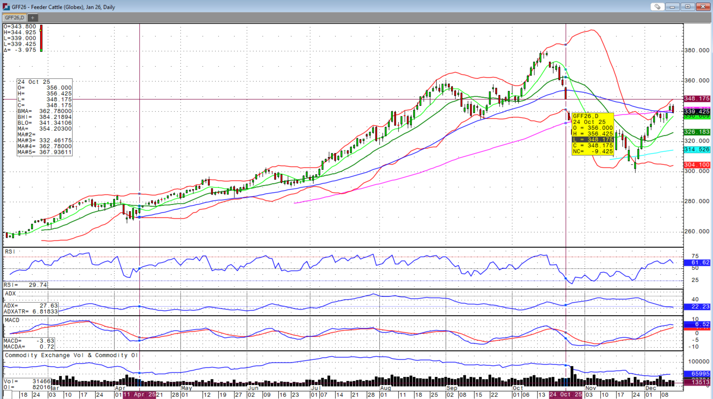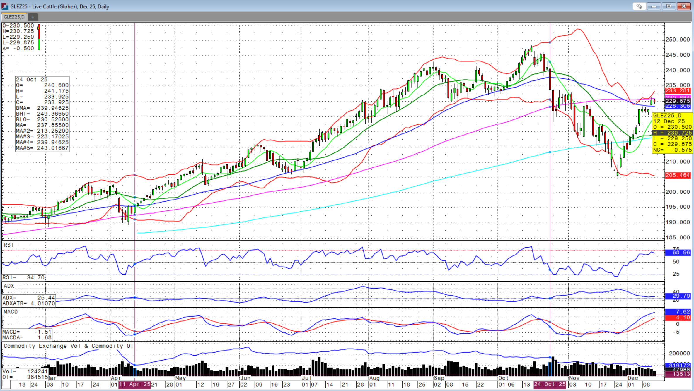 We did see some profit taking on Friday with feeder and live cattle futures closing right at their 50-day moving averages. However, this was only the 3rd session with a lower close in the last 13 consecutive sessions since that pre-Thanksgiving low. Cash, sale barn prices for weaned calves is back near the records as buyers return in droves to increase numbers before year-end. While it was a disappointing close on Friday with some contracts making a higher high and lower low versus Thursday’s trade, the gap below that some are calling an island gap, may not fill and we see a return of buyers on Monday to chase the CME Feeder Cattle Cash Index that is around $345.00 versus January feeder futures now sub-$340.00.  The big chart gap above on January feeders will fill when the market reaches $348.175.  Then, there is another chart gap at $356.875.  And then, the final gap at $376.750 from October 16th, the same day as the high was made at $380.200.