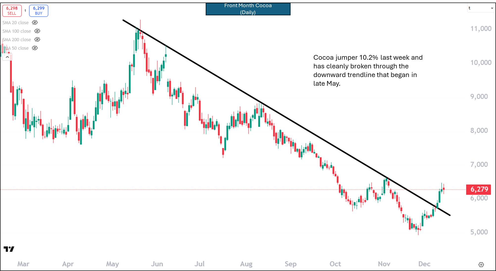 In the weeks since cocoa was added to the upcoming January rebalancing schedules for the Bloomberg Commodity Index (BCOM) and S&P GSCI, traders have been watching closely for signs that passive flows were starting to hit the market. This past week delivered clear confirmation: cocoa futures surged 10.2% in the front month, a powerful move for a market of its size and liquidity profile. But the most important takeaway is that this was only the beginning.