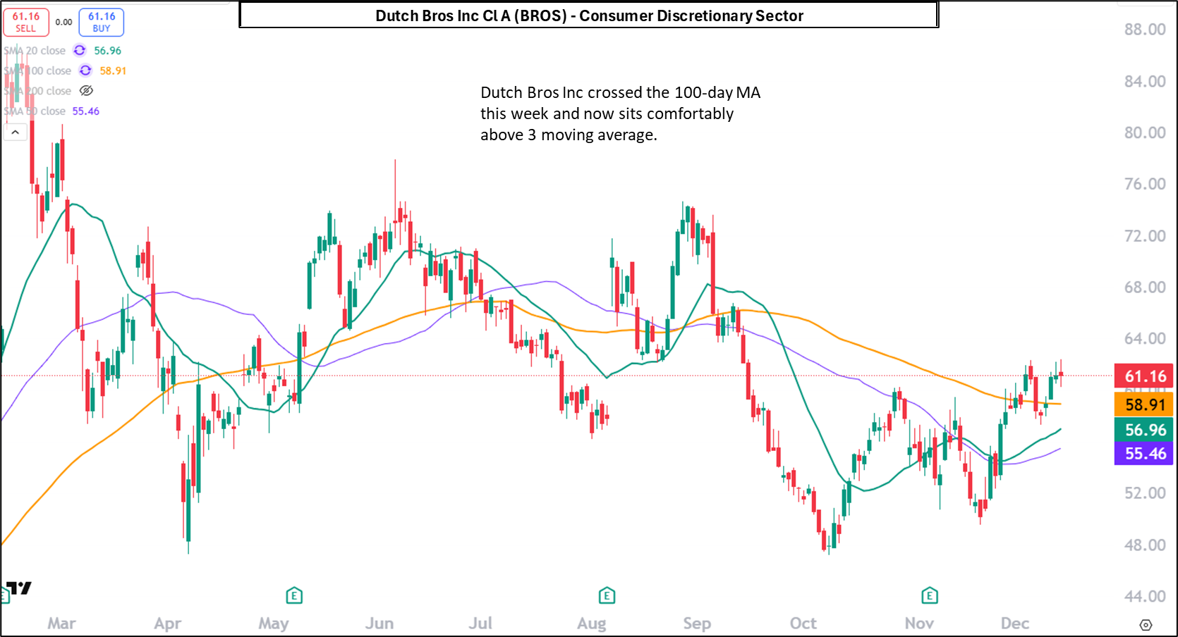 Dutch Bros Inc crossed the 100-day MA this week and now sits comfortably above 3 moving average.