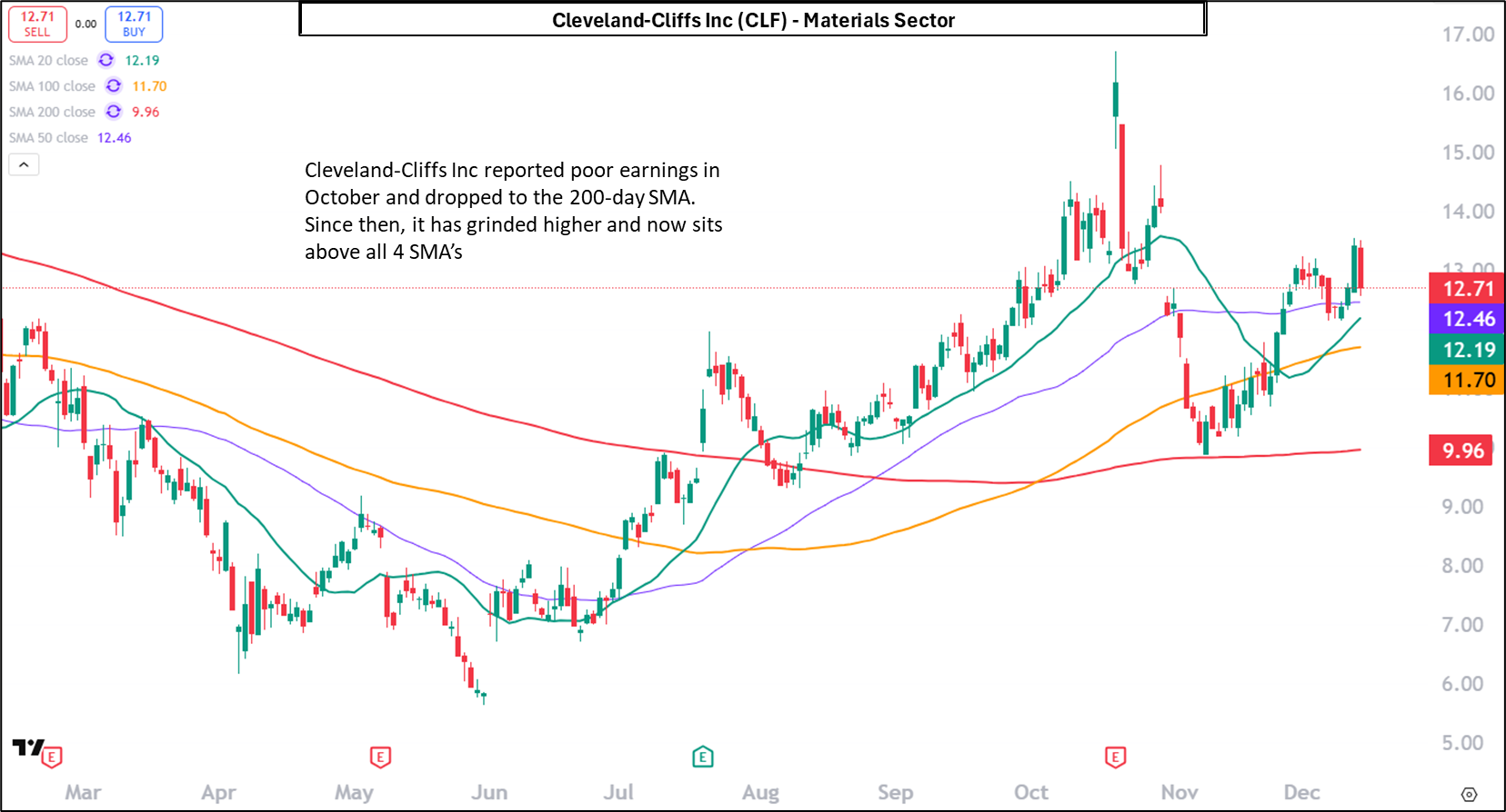 Cleveland-Cliffs Inc reported poor earnings in October and dropped to the 200-day SMA. Since then, it has grinded higher and now sits above all 4 SMA’s