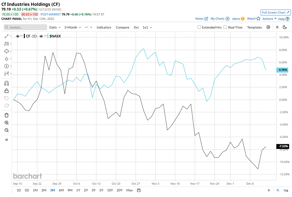 Despite the industrial footprint, CF’s share price tells a more volatile story. The stock trades 24.2% below its June peak of $104.45 and has declined almost 7.5% over the past three months. Over the same period, the Nasdaq Composite ($NASX) advanced 4.8%, highlighting relative underperformance.