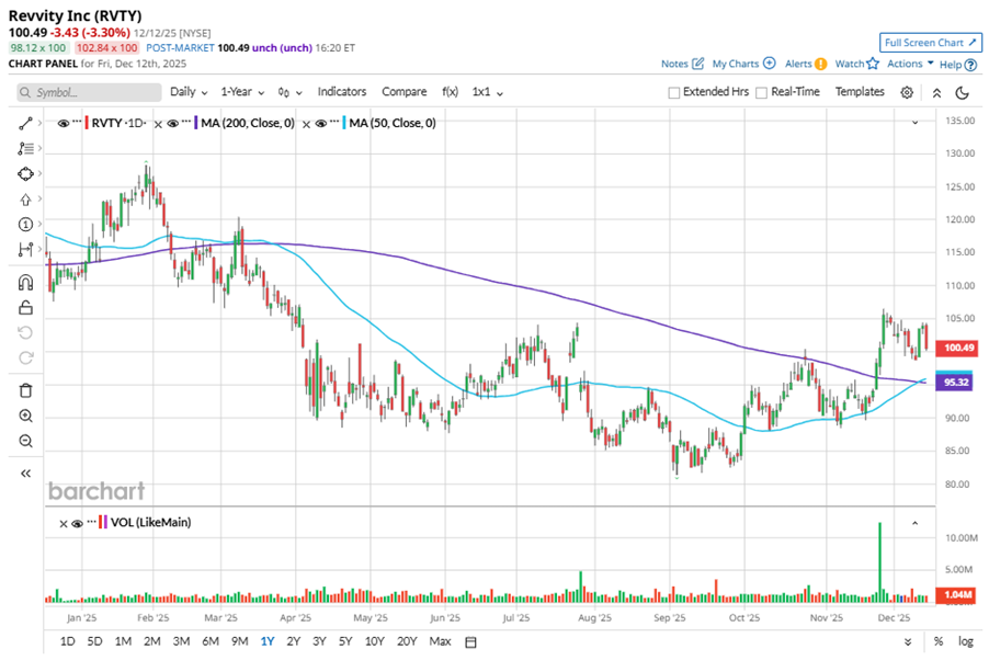 Despite its notable strength, RVTY slipped 21.7% from its 52-week high of $128.29, achieved on Jan. 30. Over the past three months, RVTY stock has gained 21.3%, outperforming the Health Care Select Sector SPDR Fund’s (XLV)11.6% gains during the same time frame.