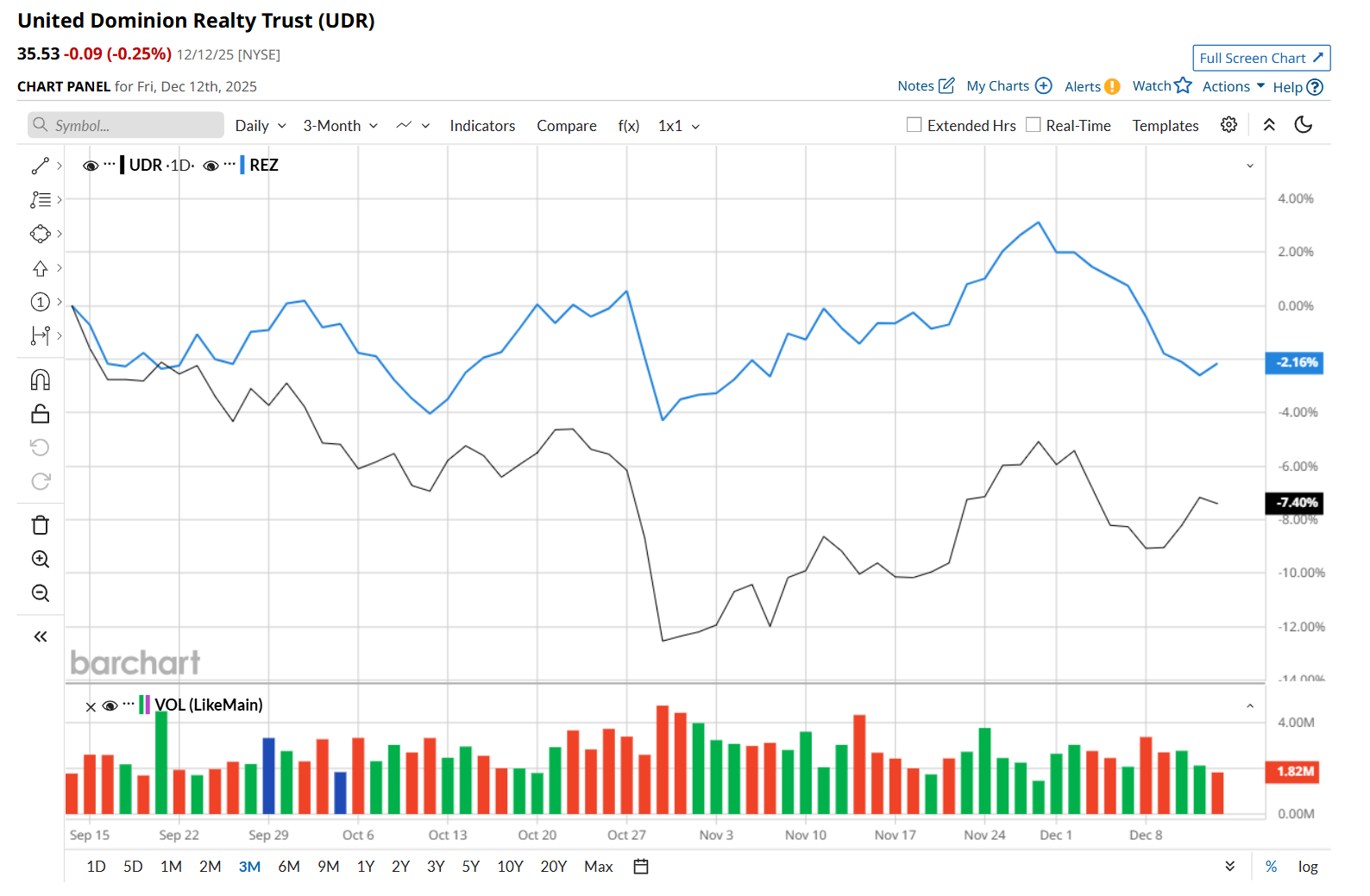 In the longer term, UDR has fallen 20.7% over the past 52 weeks, considerably lagging behind REZ’s 1.5% downtick over the same time frame. Moreover, on a YTD basis, shares of UDR are down 18.2%, compared to REZ’s 2.5% return.