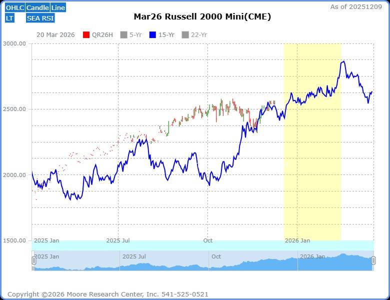 As we wrap up 2025, it's clear that small caps have finally started to reclaim some ground after years in the shadow of those mega-cap tech darlings. With cheaper valuations, more substantial earnings growth on the horizon, and a favorable setup from lower rates and a solid economy, this points to more upside ahead. The technicals are cooperating too, the Russell futures are bouncing off key support and eyeing new highs. At the same time, while those high-correlation years and that MRCI seasonal pattern into mid-February (87% winners over 15 years, averaging over 60 points) are screaming for attention right now in the March '26 contract. If you're a futures or equities trader sitting on the sidelines, this feels like one of those setups worth digging into deeper. Pull up your charts, layer in the seasonals with the fundamentals and technicals, properly manage your risk, and see if there's a real opportunity here to catch the next leg of this rotation before it plays out.