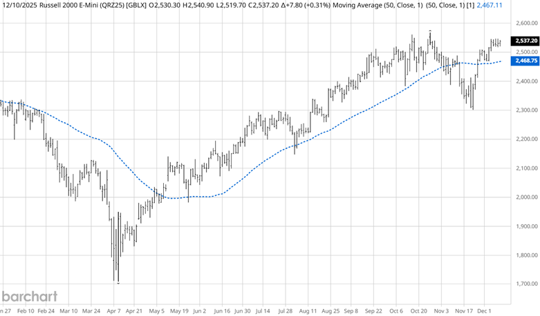 Year-to-date, the nearby daily chart of the Russell 2000 shows that the 50-day simple moving average (SMA) has served as both support and resistance. After a brief dip under the SMA in early November, the Russell 2000 has come back strong. Reaching levels that are within striking distance of all new highs.