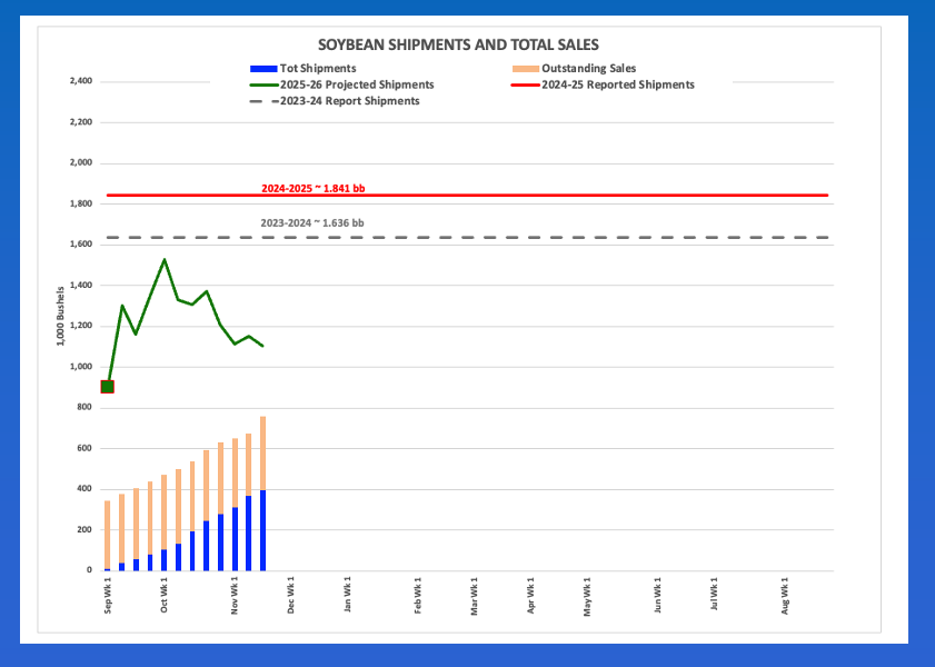 But was China buying? As of Thursday, November 20, China reportedly had 2.506 mmt (92 mb) on the books as compared to 4.319 mmt (159 mb) the same week the previous marketing year. It should be noted that on Thursday, October 2, as the US government was locked down, China had no US soybeans on the books for the 2025-2026 marketing year. Also at that time, the US was on pace to ship a total of 41.6 mmt (1.529 mb) meaning the pace projection decreased during the shutdown.
