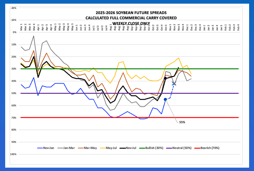 - The March-May spread moved from 50% to 23% during that same time frame, though has since moved back to 36% indicating renewed commercial selling tied to the outlook of Brazil’s 2026 production.
