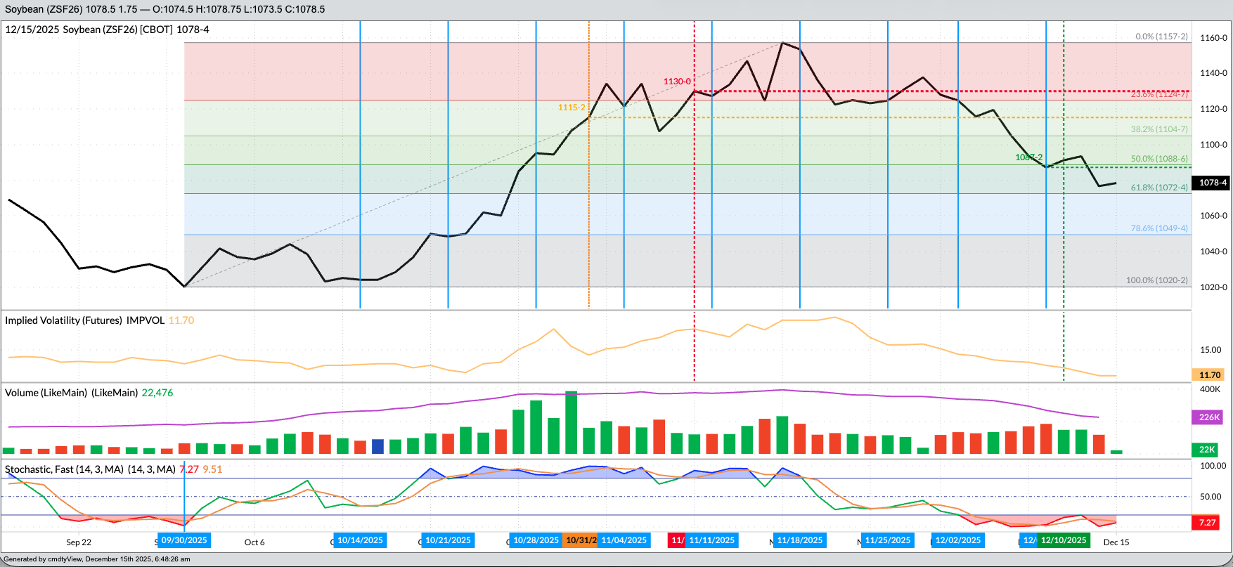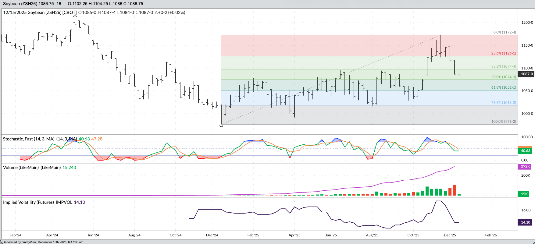 - Mar26 (ZSH26) posted a key bearish reversal the week of November 17. In other words, the contract extended the previous intermediate-term uptrend to a high of $11.7250 before taking out the previous week’s low of $11.2725 and closing Friday, November 21 at $11.3425, down 1.75 cents for the week. This reversal pattern confirmed a move to a new secondary downtrend, signaled the week before with a bearish crossover by weekly stochastics (momentum indicator) above the overbought level of 80%.