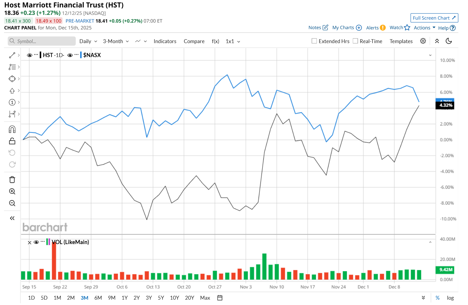 This hotel REIT is currently trading 3.5% below its 52-week high of $19.03, reached on Dec. 16, 2024. Shares of HST have gained 4.3% over the past three months, slightly underperforming the Nasdaq Composite’s ($NASX) 4.8% rise during the same time frame.