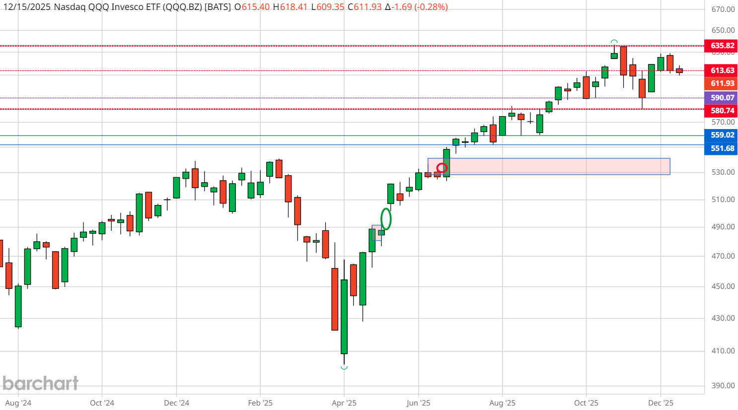 From here, only a daily close above 619.25 can negate this bearish condition, and a weekly close above last week's candle high would signal an attempt at the all-time highs (ATHs).