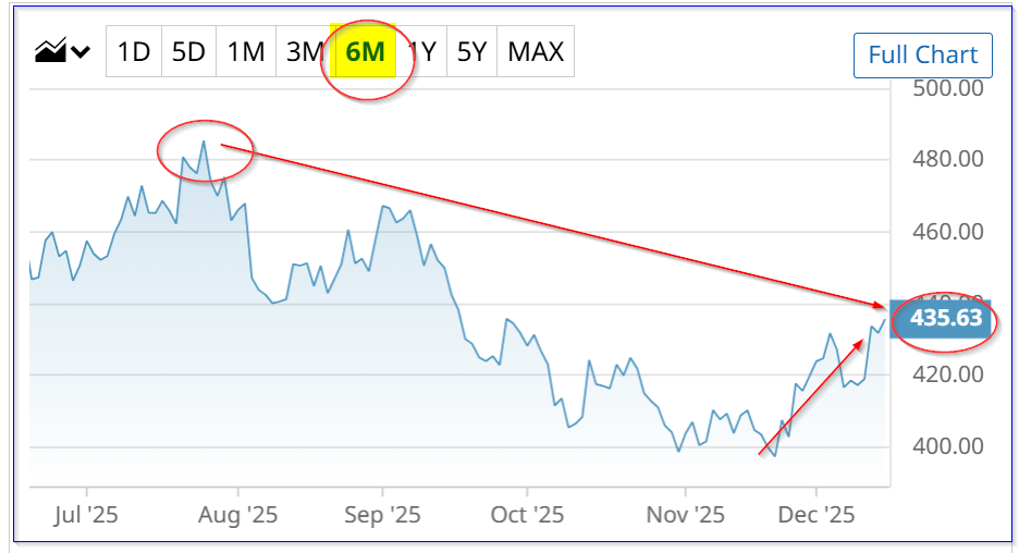 That is also the same as buying in at $418.48 from my first article on Oct. 17 and seeing the stock rise to $437.79 (i.e., $418.48 x 1.04615). That is slightly higher than today's stock price.