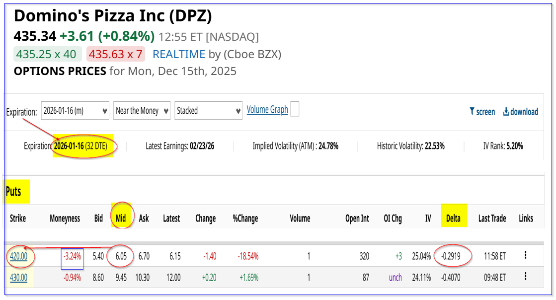 Today, DPZ stock is well over that strike price at $435.31 with 5 days left until expiry. So, this short-put play has worked well, as the put premium has fallen to just 18 cents at the midpoint.