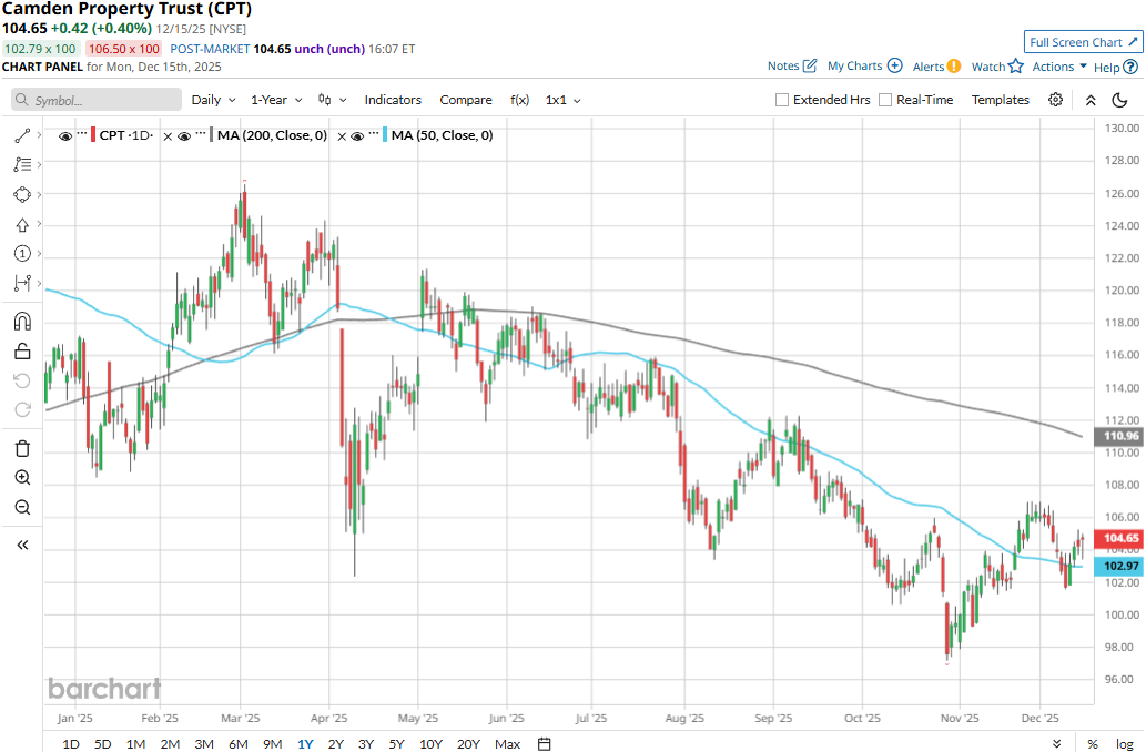 Houston, Texas-based Camden Property Trust (CPT) engages in the ownership, management, development, repositioning, redevelopment, acquisition, and construction of multifamily apartment communities. With a market cap of $11.1 billion, Camden operates as one of the major owners of apartments in the United States.
