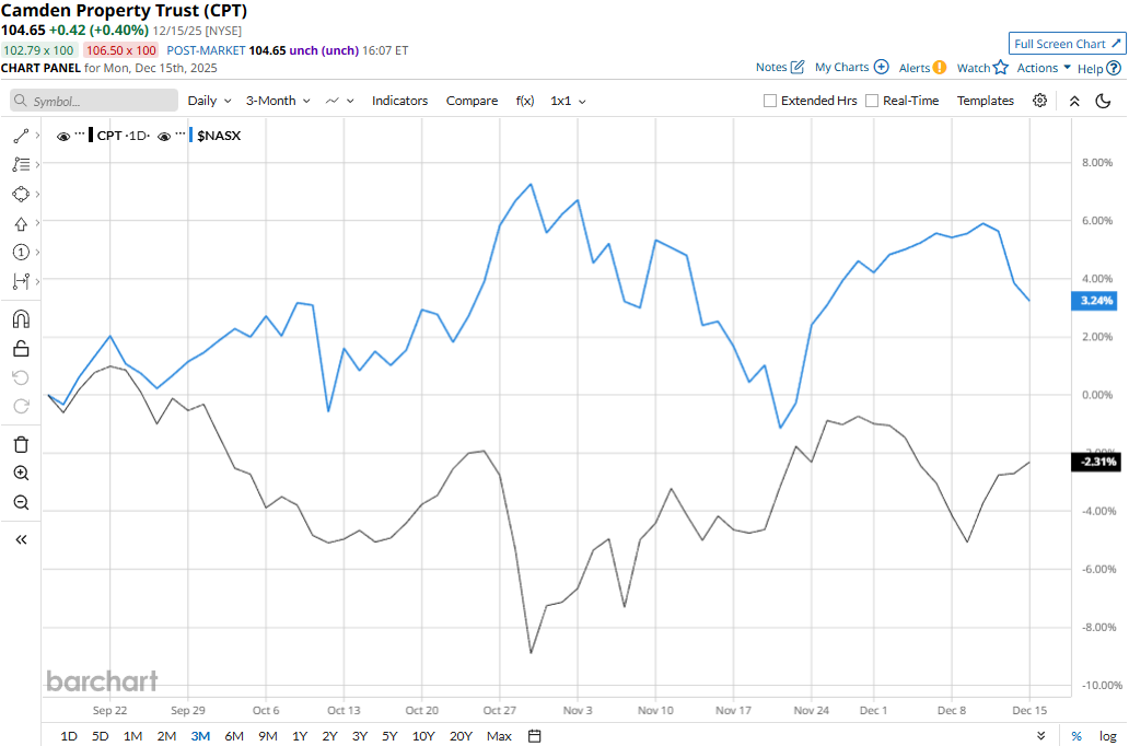 Camden’s performance has remained grim over the longer term as well. CPT stock prices have declined 9.8% on a YTD basis and plunged 12.9% over the past 52 weeks, lagging behind the Nasdaq’s 19.4% surge in 2025 and 15.7% growth over the past year.