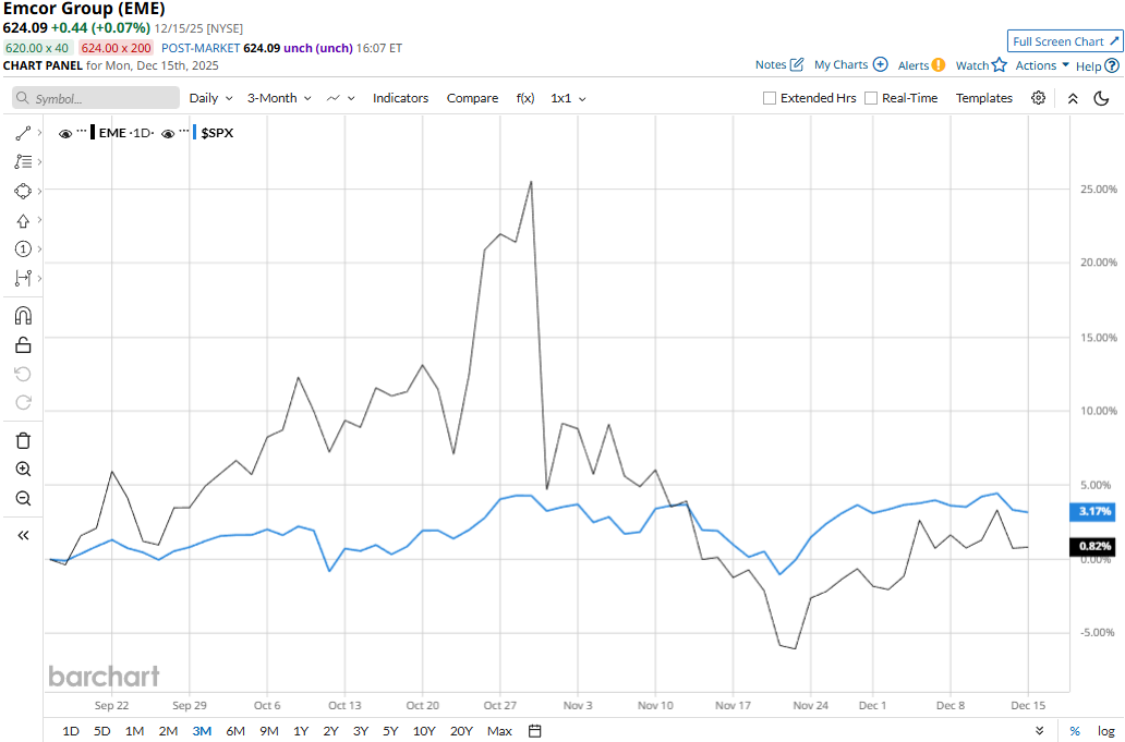 EMCOR touched its all-time high of $778.64 on Oct. 29 and is currently trading 19.8% below that peak. Meanwhile, EME stock prices have observed a marginal 74 bps dip over the past three months, underperforming the S&P 500 Index’s ($SPX) 3% uptick during the same time frame.
