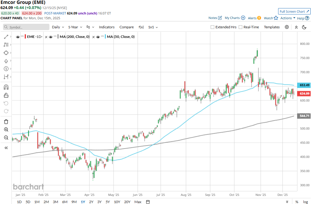EME stock has traded consistently above its 200-day moving average since early May and dropped below its 50-day moving average in early November, underscoring its previous bullish trend and recent downturn.