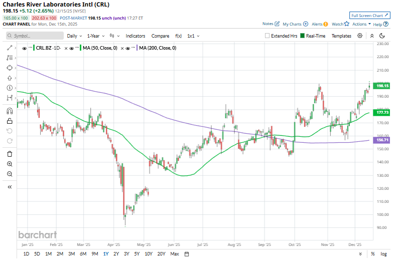 On Dec. 15, shares of Charles River Laboratories gained more than 2% after JPMorgan Chase & Co. (JPM) raised its price target on the stock to $190 from $165, reflecting increased optimism around the company’s fundamentals and future growth prospects. The upgrade signaled stronger analyst confidence in CRL’s ability to navigate near-term challenges and deliver improved performance over the medium term.