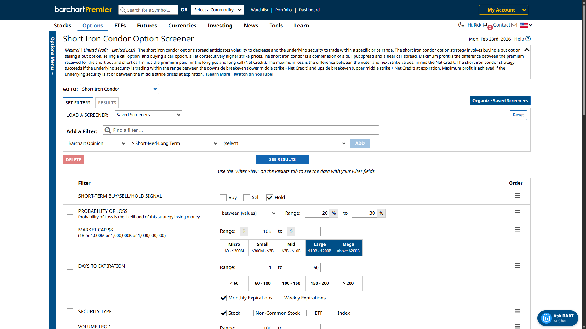 Now, all Barchart option screeners come with default filters that give you a balanced list of potential trades. However, I like to add a couple of filters when I’m screening for short iron condors. It often depends on how granular I want the screens to be, but here's a quick example of what I usually default to.