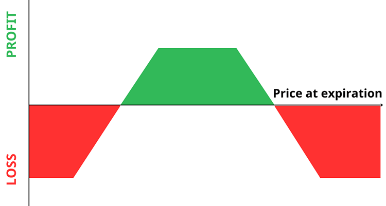 The overall goal of an iron condor is for the underlying asset to trade between the short strike prices at expiration.