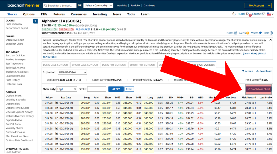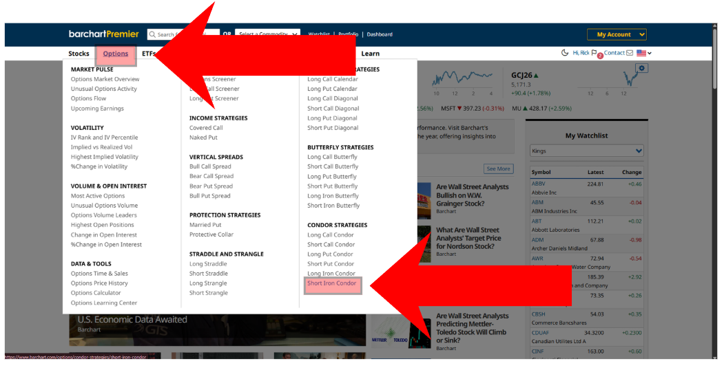 To find potential short iron condor trades, you can click the Options section at the top of Barchart.com’s main page, then click Short Iron Condor.