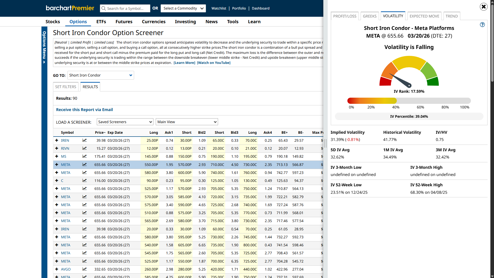 According to the screener, you can sell a 550-570/710-730 strike short iron condor on Meta, which is currently trading around $657. This spread is quite wide, giving the underlying asset lots of room to move for the trade to stay profitable.