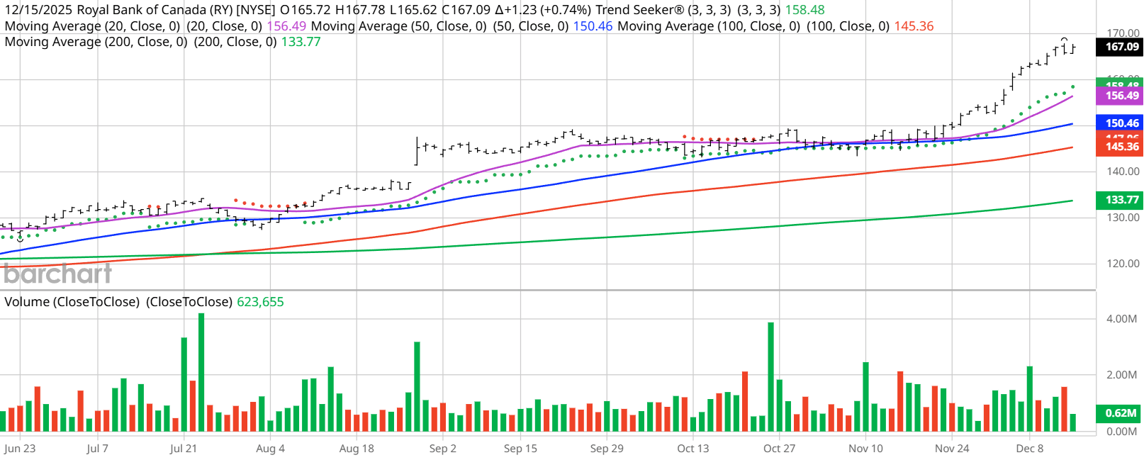- Royal Bank of Canada (RY) is Canada’s largest bank, showing strong technical momentum.
