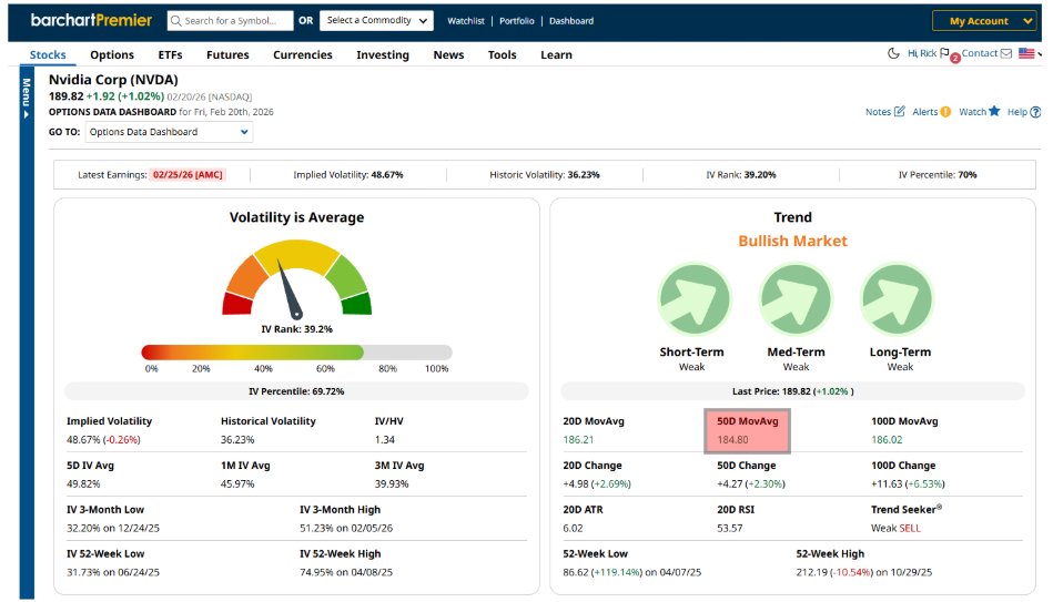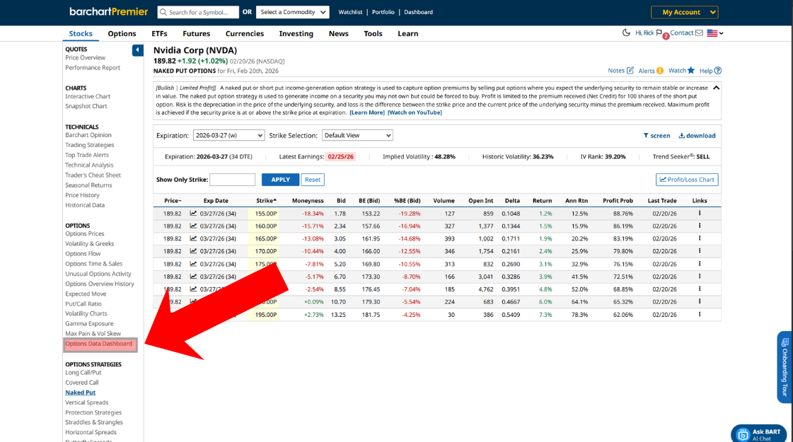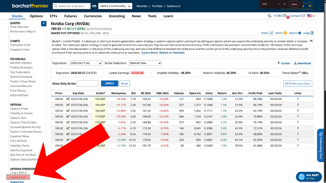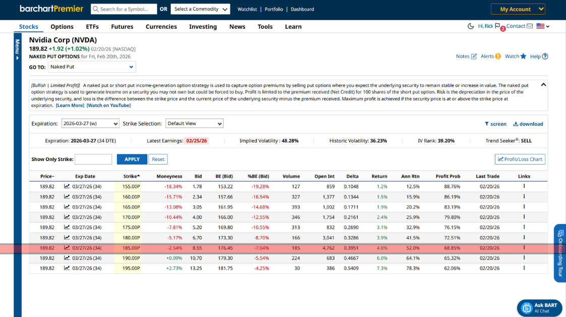 Barchart can help you find option trades easily. Let’s say, for example, you want to sell a cash-secured put on Nvidia. As of the time of publication, the stock has been trading relatively sideways over the last few months, and the company will release its much-anticipated fiscal fourth-quarter and full-year 2026 financials on February 25, 2026.
