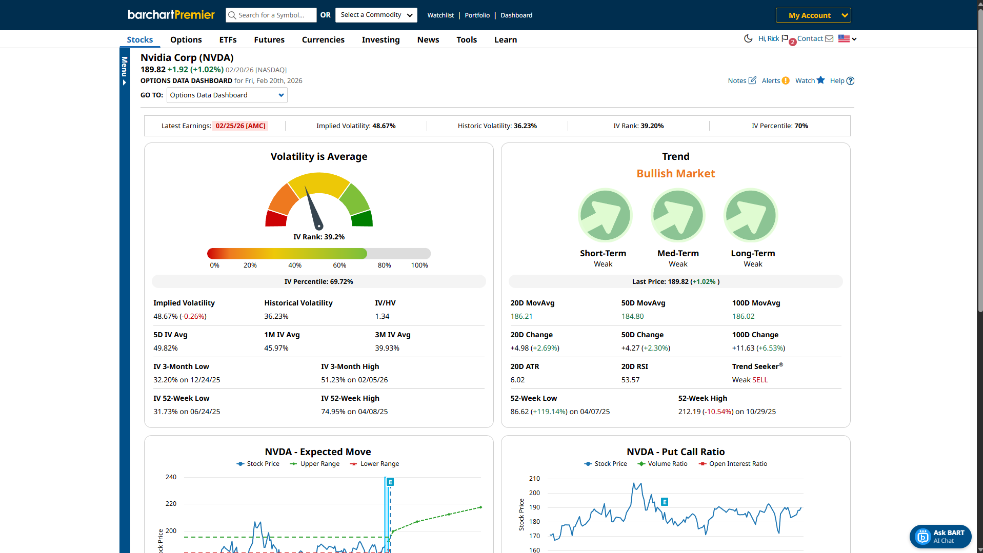 From here, you’ll be able to quickly see relevant trade details, such as volatility, trend, expected move, and the Put-Call ratio.