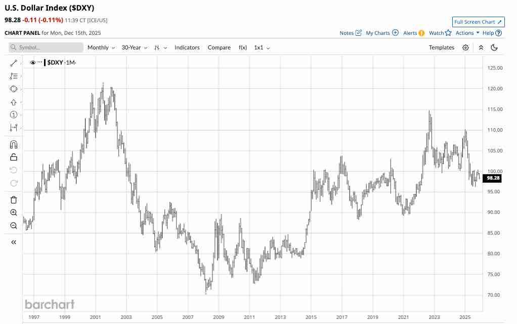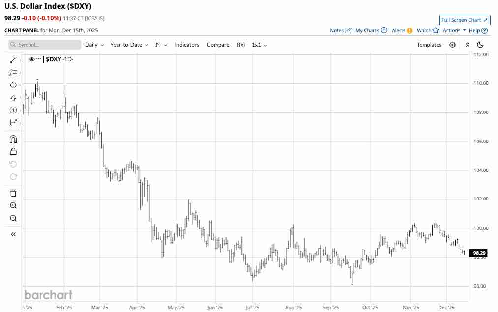 The year-to-date dollar index chart shows the index has traded around the 100 pivot point since mid-April 2025, remaining primarily below since late May. In mid-December, the index was trading just below the 98.30 level and was within the trading range.Â